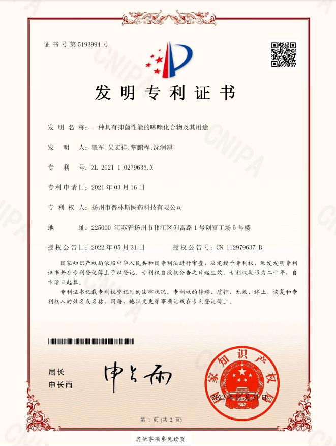 近年來(lái),普林斯醫(yī)藥著重加大對(duì)科研技術(shù)的投入力度,積極開(kāi)展技術(shù)創(chuàng)新工作,注重知識(shí)產(chǎn)權(quán)保護(hù),截止目前已擁有國(guó)家知識(shí)產(chǎn)權(quán)局授權(quán)發(fā)明專利及實(shí)用新型專利共計(jì)14項(xiàng);同時(shí)結(jié)合公司項(xiàng)目研發(fā)情況,在項(xiàng)目立項(xiàng)前就注重發(fā)明專利的申請(qǐng),今年已提交的專利申請(qǐng)共計(jì)7項(xiàng),現(xiàn)累計(jì)已獲得5項(xiàng)發(fā)明專利。發(fā)明專利的獲得,進(jìn)一步增強(qiáng)了公司技術(shù)核心競(jìng)爭(zhēng)力,為公司的未來(lái)發(fā)展提供了強(qiáng)有力的科技支撐!