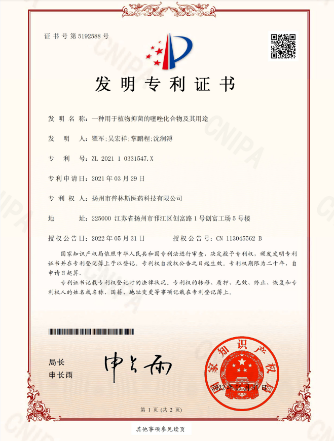 近日,聯(lián)環(huán)集團(tuán)下屬企業(yè)揚(yáng)州市普林斯醫(yī)藥科技有限公司申報(bào)的“一種具有抑菌性能的噻唑化合物及其用途”、“一種噻唑化合物及其用途”、“一種用于植物抑菌的噻唑化合物及其用途”、“一種抑制腫瘤細(xì)胞生長(zhǎng)的噻唑化合物及其用途”4項(xiàng)發(fā)明專利,獲得國(guó)家知識(shí)產(chǎn)權(quán)局授權(quán)并取得專利證書(shū)。